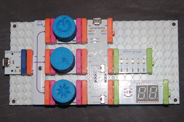 In case it wasn’t clear from my recent cameo on some RadioShack fliers, I’ve been having a bunch of fun with LittleBits‘, more sophisticated modules recently. A few months ago, I posted a project showing how to use the CloudBit to connect your umbrella stand to the internet. This latest project leverages the LittleBits Arduino Bit, a small linux computer (like a BeagleBone, Raspberry Pi, or UDOO), and the Philips Hue Hub to easily control the state, brightness, and color of your Hue lightbulbs via a tactile interface.