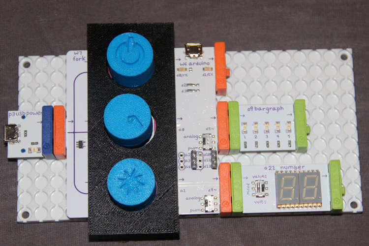 Step 1: Place the Bits on the backer board as shown. Print the button/dial covers. Slightly heat the button/dial covers and press them onto the buttons and covers as shown.